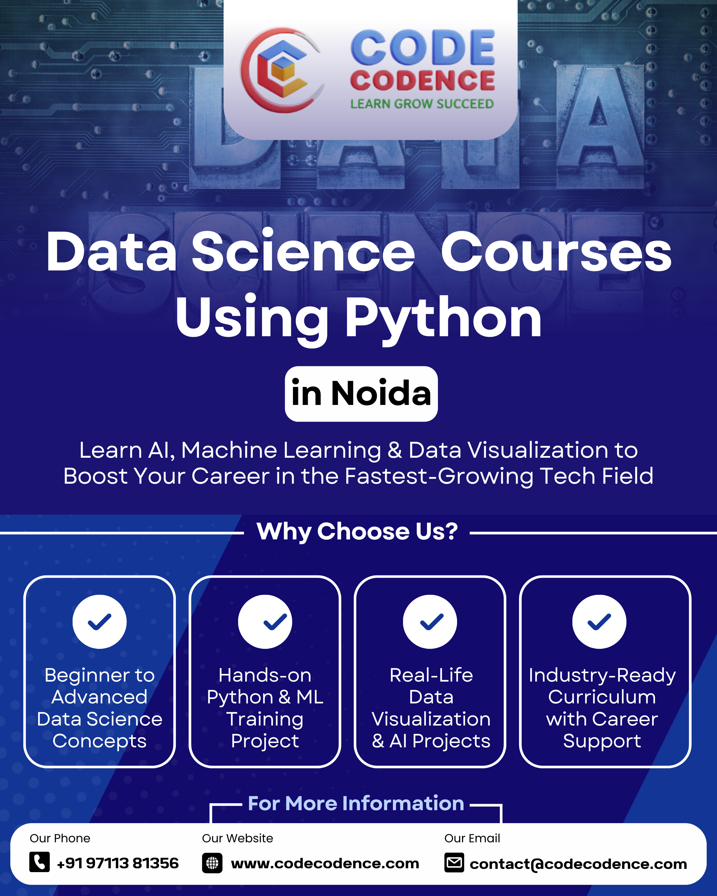 If you’re passionate about numbers, patterns, and problem-solving, now is your moment to act. Enroll in Code Codence’s Data Science Course Using Python in Noida and take the first step toward an exciting, high-paying, and globally relevant career.